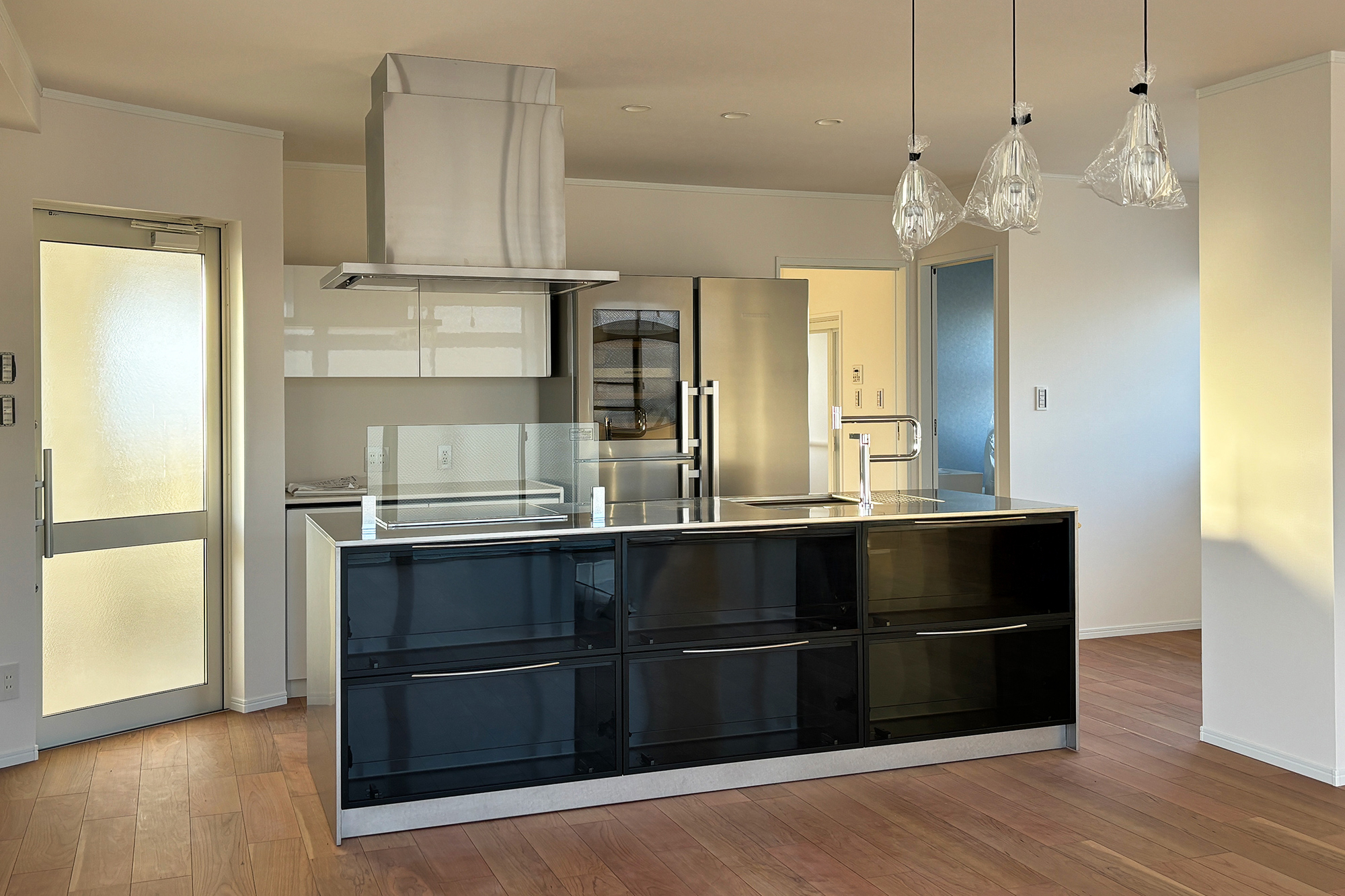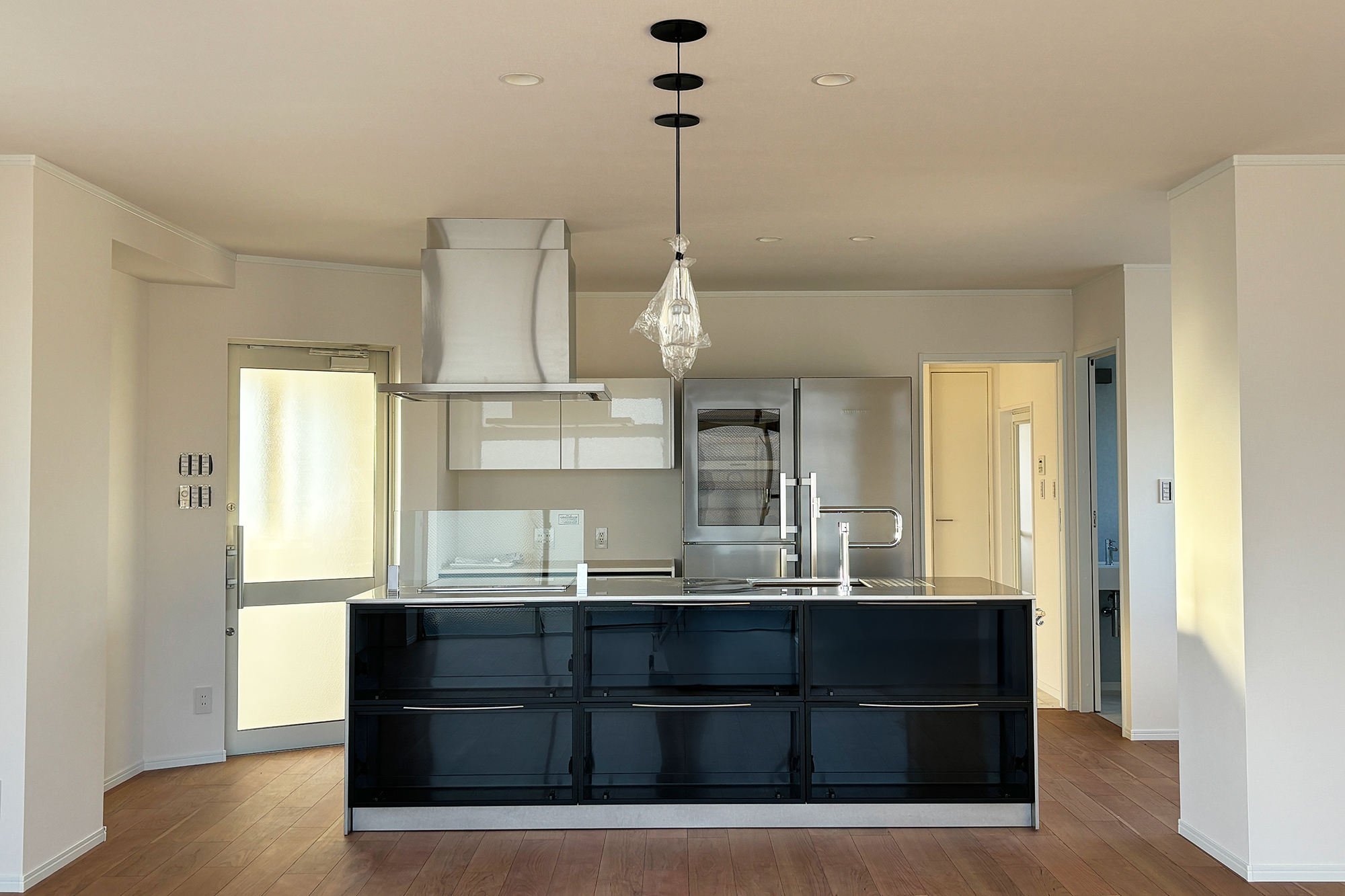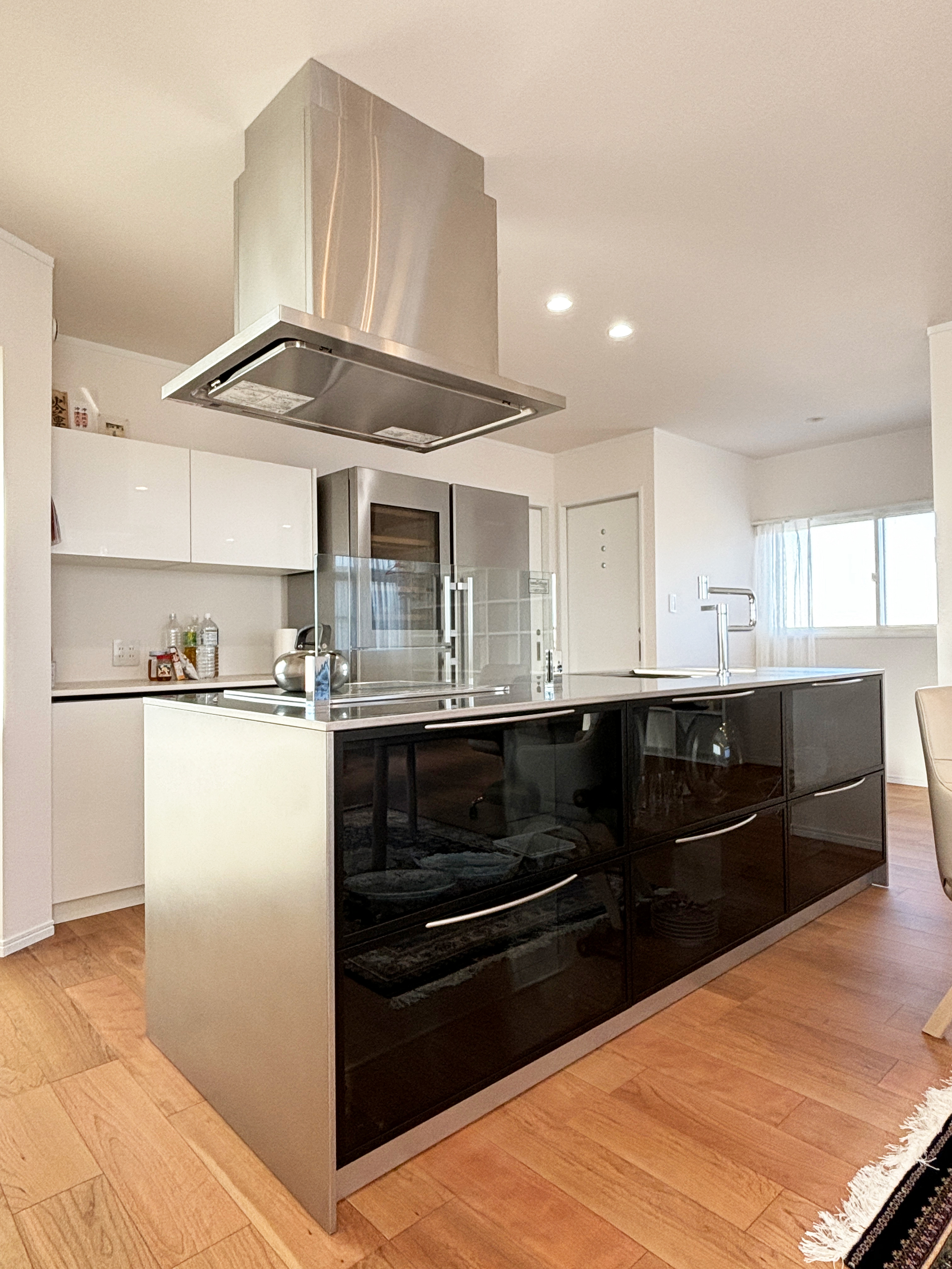 ステンレスとブラックガラスが美しく調和したモダンなオープンキッチンとなりました。