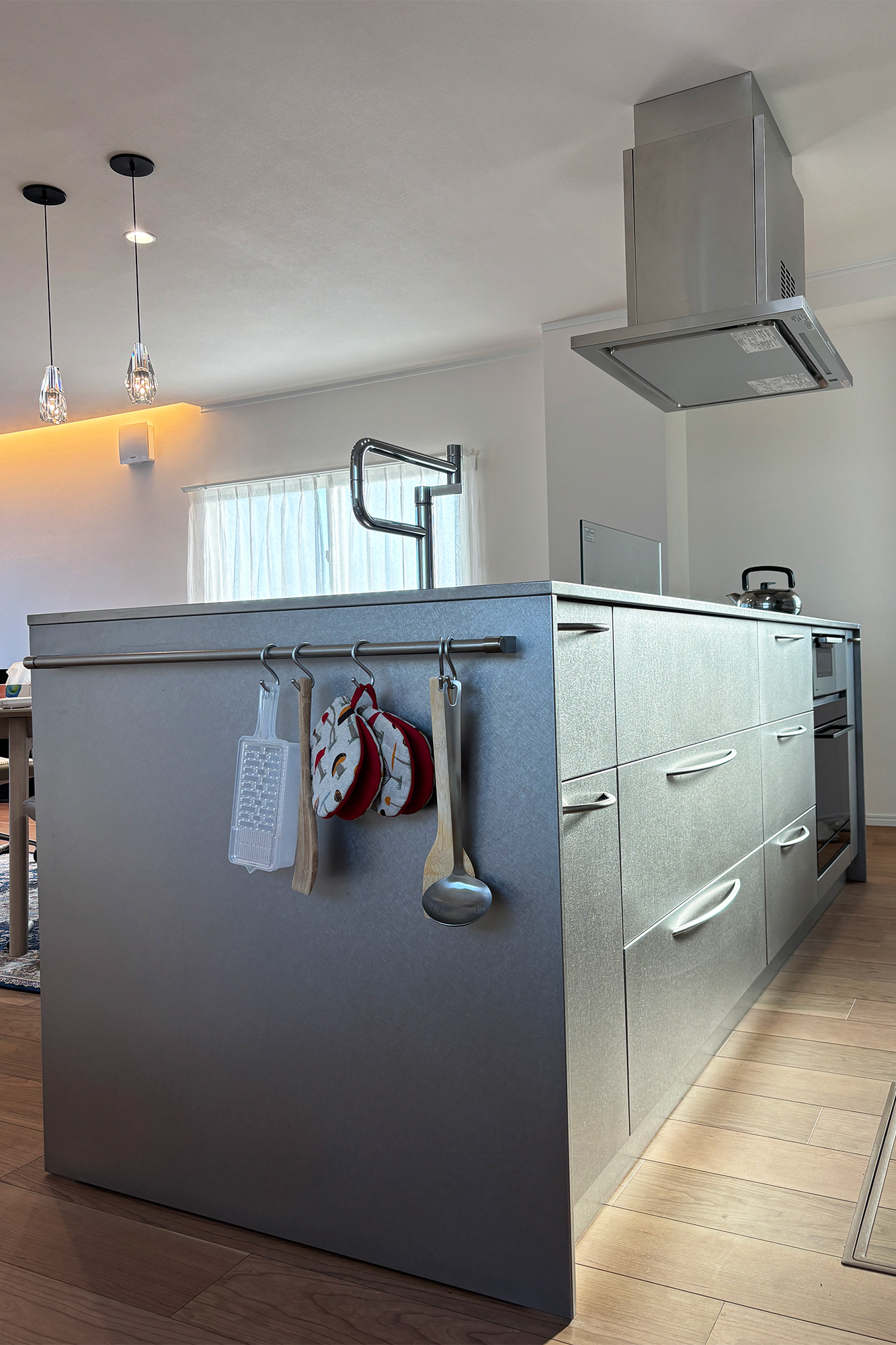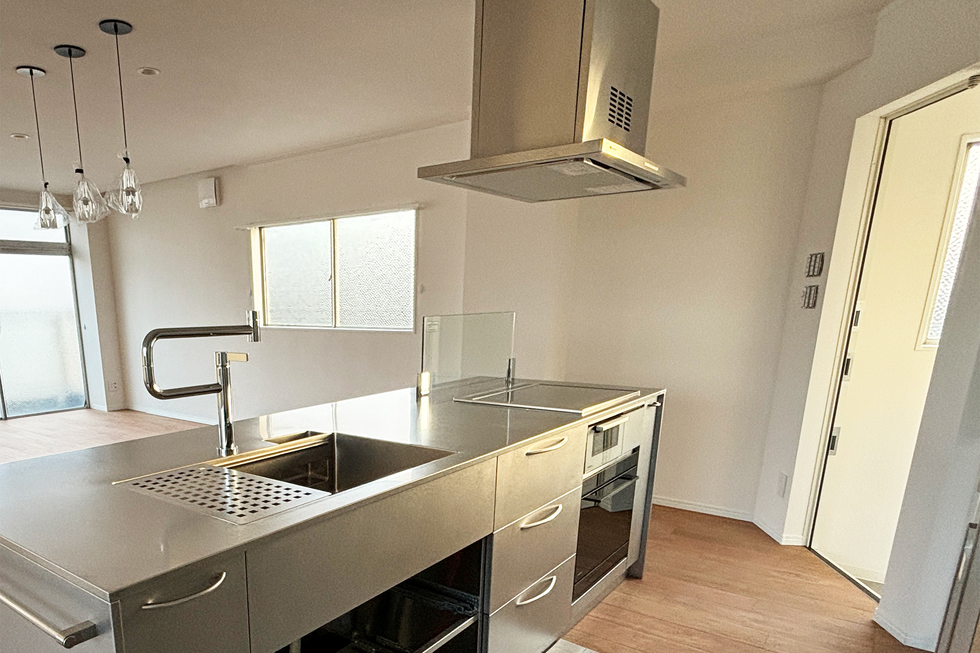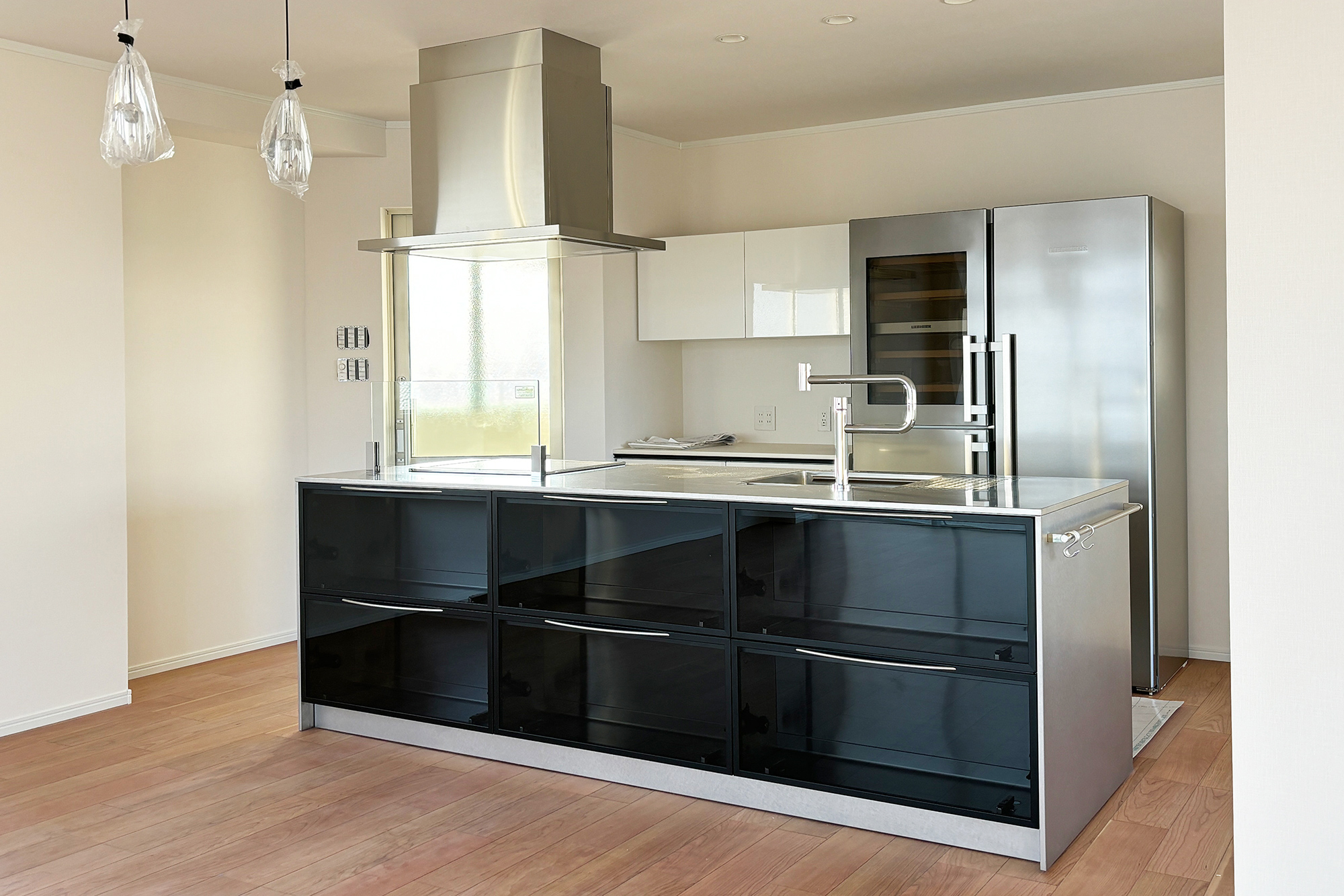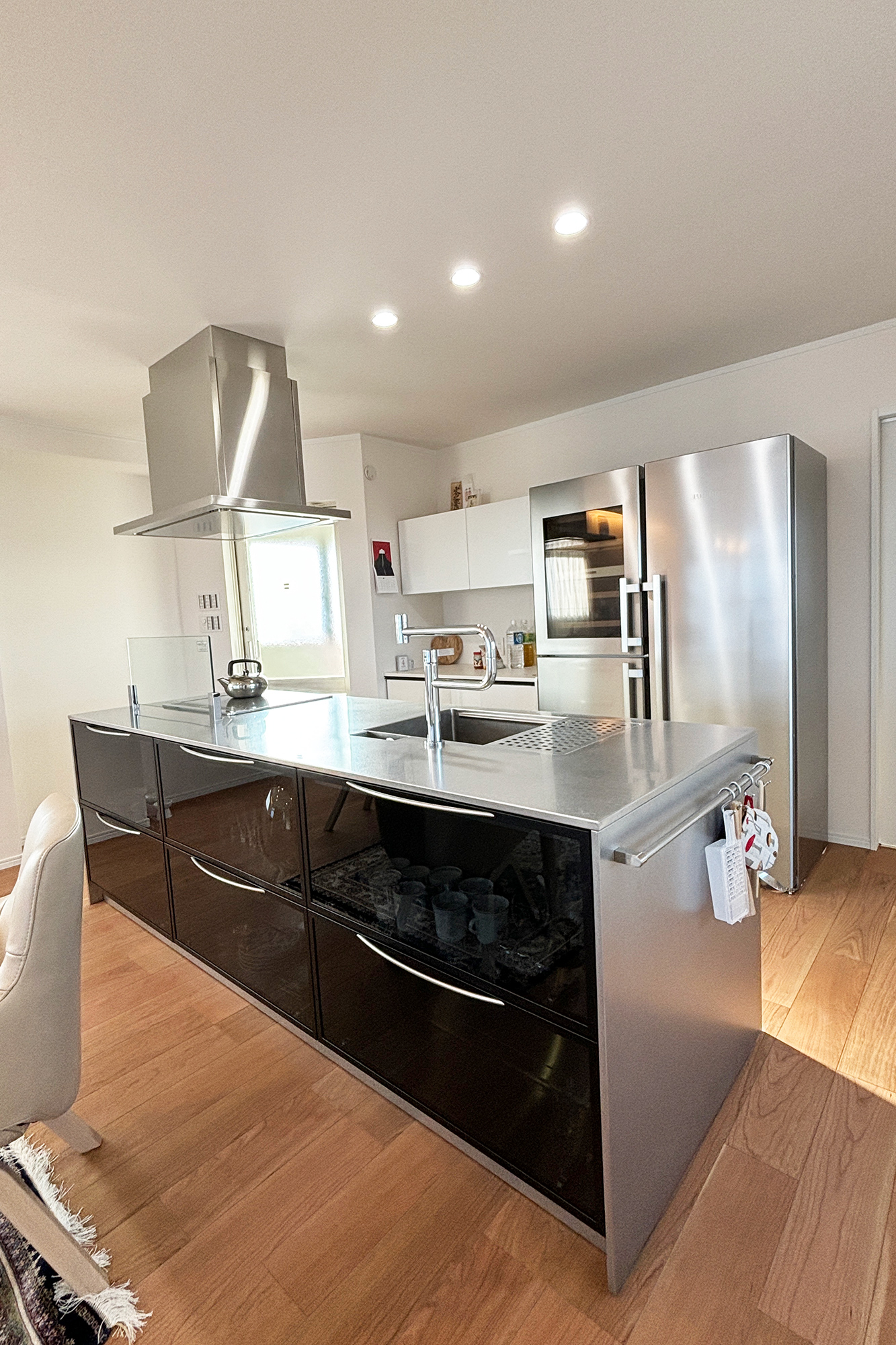 ステンレスとブラックガラスが美しく調和したモダンなオープンキッチンとなりました。